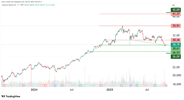 Seit Mitte März 2022 zeigt die Kursentwicklung der Deutschen Telekom langfristig wieder eine Aufwärtsdynamik. Einen wesentlichen Beitrag dazu leistet die schrittweise Integration der Tochtergesellschaft T-Mobile US. Die positiven Wachstumszahlen aus den USA haben auch die Muttergesellschaft in Deutschland gestärkt. Besonders hervorzuheben ist die Aufwärtsbewegung vom 17. April 2024 bis zum 3. März 2025, in der der Kurs um rund 58 Prozent zulegte. Seit dem 3. März 2025 befindet sich der Aktienkurs in einer Konsolidierungsphase, die bisher intakt geblieben ist. Belastend wirkt sich insbesondere der Markteintritt von Starlink in Europa und den USA auf die Kursentwicklung aus. Seit dem 8. September 2025 ist ein Kursrückgang von etwa 9,63 Prozent zu verzeichnen. Aktuell verharrt der Aktienkurs der Deutschen Telekom an der Unterstützungszone bei 28,61 Euro. Sollte diese Marke nachhaltig unterschritten werden, könnte ein Test der nächsten Unterstützung bei 26,53 Euro folgen. Mit einem erwarteten Kurs-Gewinn-Verhältnis (KGV) von 14,98 für das Jahr 2025 gilt die Deutsche Telekom nicht als günstig bewertet. Die Konsensschätzungen für 2026 und 2027 prognostizieren aber steigende Bilanzgewinne, sodass das erwartete KGV für 2027 derzeit bei 11,96 liegt. Sollten Zweifel am Gewinnwachstum aufkommen, könnte dies den Aktienkurs negativ beeinflussen.