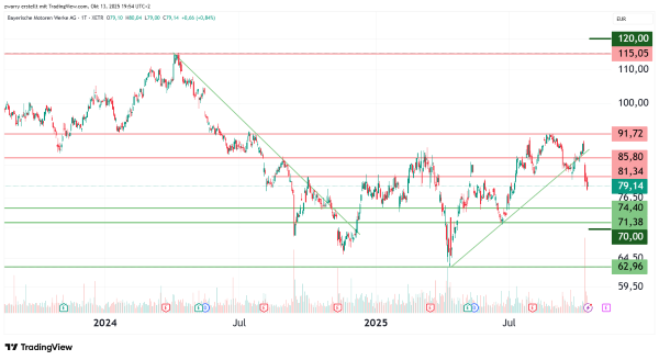 Ab dem 11. April 2024 war eine Abwärtsbewegung zu beobachten, die am 2. Dezember durchbrochen wurde. Dabei wurde der Bereich bei 65,26 Euro getestet. Anschließend entwickelte sich bis zum 16. Februar 2025 eine Seitwärtsbewegung, bei der sich die Unterstützung auf dem Niveau von 74,40 Euro als untere Begrenzung etablierte. Aktuell bewegt sich die Aktie nach mehreren Rückschlägen wieder zwischen dem Widerstand bei 81,34 Euro und der Unterstützung bei 74,40 Euro. Die Kursrückgänge sind auf den von Donald Trump initiierten „Liberation Day“ Anfang April 2025 und die folgende Zollpolitik im Allgemeinen zurückzuführen. Die Einigung auf Importzölle in die USA bei 15 Prozent sollte für die BMW-Führung jedoch zu managen sein. Auch das Werk in Spartanburg, South Carolina, sorgt für zusätzliche Flexibilität bei diesem Thema. Als Absicherung nach unten könnte der Unterstützungsbereich zwischen 71,38 Euro und 74,40 Euro dienen. Gleichzeitig besteht die Möglichkeit, dass BMW mit seinem neuen Flaggschiff iX3 auf dem Weltmarkt, insbesondere in China, Marktanteile zurückgewinnt. Ein Erfolg des iX3 in Fernost könnte sich auch positiv auf andere Märkte auswirken. In diesem Fall besteht weiteres Aufwärtspotenzial der Aktie bis auf 91,72 Euro. Auf dem Weg dorthin müsste aber zuerst die Widerstandszone zwischen 81,34 Euro und 85,80 Euro überwunden werden.