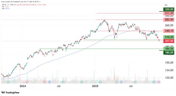 Mit einem Inline-Optionsschein, bezogen auf die Aktie der SAP SE (FD0Q4G), können risikofreudige Anleger einen maximalen Auszahlungsbetrag von 10,00 Euro erzielen. Dafür muss sich der Kurs bis einschließlich 16.01.2026 durchgehend innerhalb der für den Inline-Optionsschein maßgeblichen Spanne zwischen 180,00 Euro auf der Unterseite und 320,00 Euro auf der Oberseite bewegen. Gerechnet vom Stand des Scheins am 17. November 2025 um 20:00 Uhr (Briefkurs 8,29 Euro) würde dies einem annualisierten Kursgewinn von 125,48 Prozent entsprechen. Wird eine der beiden Knockout-Schwellen erreicht, tritt ein Totalverlust des eingesetzten Kapitals ein. Falls der Kurs unter den Supportbereich bei 184,56 Euro fällt oder über den Widerstand bei 311,35 Euro klettert, sollte zur Vermeidung eines Knockouts der vorzeitige Ausstieg aus der spekulativen Position erwogen werden. Der Preis des Inline-Optionsscheins reagiert während der Laufzeit darauf, ob die Wahrscheinlichkeit des Erreichens einer der beiden Schwellen zu- oder abnimmt.