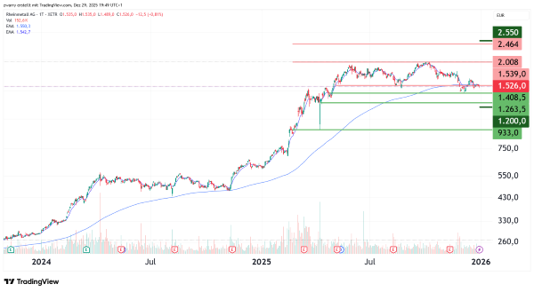Der starke Kursanstieg in diesem Jahr hat die Aktie von Rheinmetall deutlich verteuert. Seit Ende Mai 2025 bewegt sich der Rüstungskonzern somit in einer Seitwärtsrange. Diese wird durch die Unterstützung bei 1.408,50 Euro und den Widerstand bei 2.008,00 Euro begrenzt, wobei der Widerstand dem Allzeithoch vom 3. Oktober 2025 entspricht. Seit dem Allzeithoch befindet sich die Aktie auf dem Rückzug, wobei die Unterstützungszone zwischen 1.408,50 Euro und 1.539,00 Euro den Sell-Off von Mitte November 2025 gebremst hat. In den folgenden Tagen konnte eine leichte Erholung über den Widerstand bei 1.539,00 Euro beobachtet werden. Auch der Prozess zur Markierung des neuen Allzeithochs bei 2.008,00 Euro, der bis zum 28. Mai 2025 zurückreicht, könnte einen erneuten Kursanstieg in diese Region bremsen. Die Entstehung eines neuen Allzeithochs wäre vermutlich auf eine deutliche Eskalation im Ukrainekrieg zurückzuführen. Auch eine Verschärfung des Konflikts um Taiwan sollte nicht außer Acht gelassen werden. Ein Friedensvertrag zwischen Russland und der Ukraine könnte die Rheinmetallaktie nach unten ausbrechen lassen. Aus heutiger Sicht liegt der Abschluss dieses Vertrages jedoch noch weit in der Zukunft, nachdem die US-Administration und Russland quasi eine Kapitulation von der Ukraine fordern.