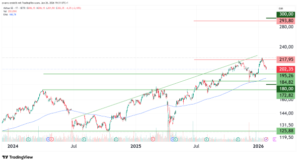 Im großen Bild betrachtet befindet sich die Aktie von Airbus in einem Aufwärtstrend, der trotz der jüngsten Verluste noch intakt erscheint. Vor dem aktuellen Kursrückgang um 9,4 Prozent wurde mit 221,25 Euro am 14. Januar 2026 ein Allzeithoch markiert. CEO Guillaume Faury sieht für die nähere Zukunft jedoch zunehmende Probleme.