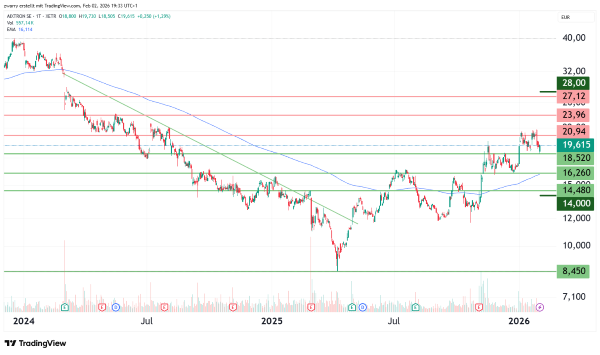 Der Chipausrüster Aixtron verzeichnete seit dem Höchststand am 14. Dezember 2023 bei 39,89 Euro erhebliche Kursverluste. Von seinem Tief bei 8,45 Euro am 7. April 2025 (Tiefpunkt vieler Aktien aufgrund des sogenannten Liberation Day) konnte sich die Aktie jedoch wieder erholen und notiert aktuell bei etwa 19,62 Euro, was einem Kursanstieg von knapp 131 Prozent entspricht. Der lang anhaltende Abwärtstrend wurde am 30. April 2025 durchbrochen. Nach einer Bodenbildungsphase folgt der Kurs ab Anfang November 2025 wieder einer Aufwärtssequenz. Im kleineren Bild betrachtet befindet sich das Papier von Aixtron in einer Seitwärtsrange, die von dem Widerstand bei 20,94 Euro und der Unterstützung bei 18,52 Euro begrenzt wird. Ein Ausbruch nach unten könnte ab dem Niveau bei 16,26 Euro wieder auf stärkere Nachfrage treffen, wodurch die Abwärtsbewegung verlangsamt werden könnte. Entwickelt sich der Kurs im Muster der vergangenen Wochen weiter, könnte in den kommenden 10,5 Wochen die Unterstützung bei 14,48 Euro unangetastet bleiben. Auch ein Ansteigen bis zum Widerstand bei 27,12 Euro in derselben Zeitspanne ist in diesem Fall möglich, aber nicht sehr wahrscheinlich. Dazu müsste der Widerstandsbereich rund um den Wert 23,96 Euro überwunden werden.